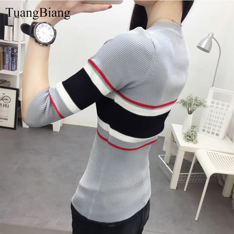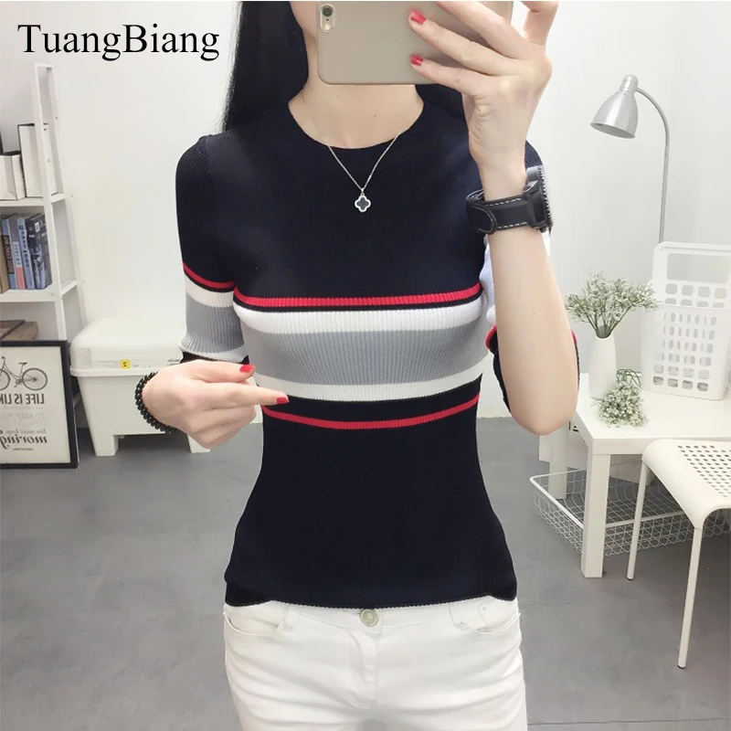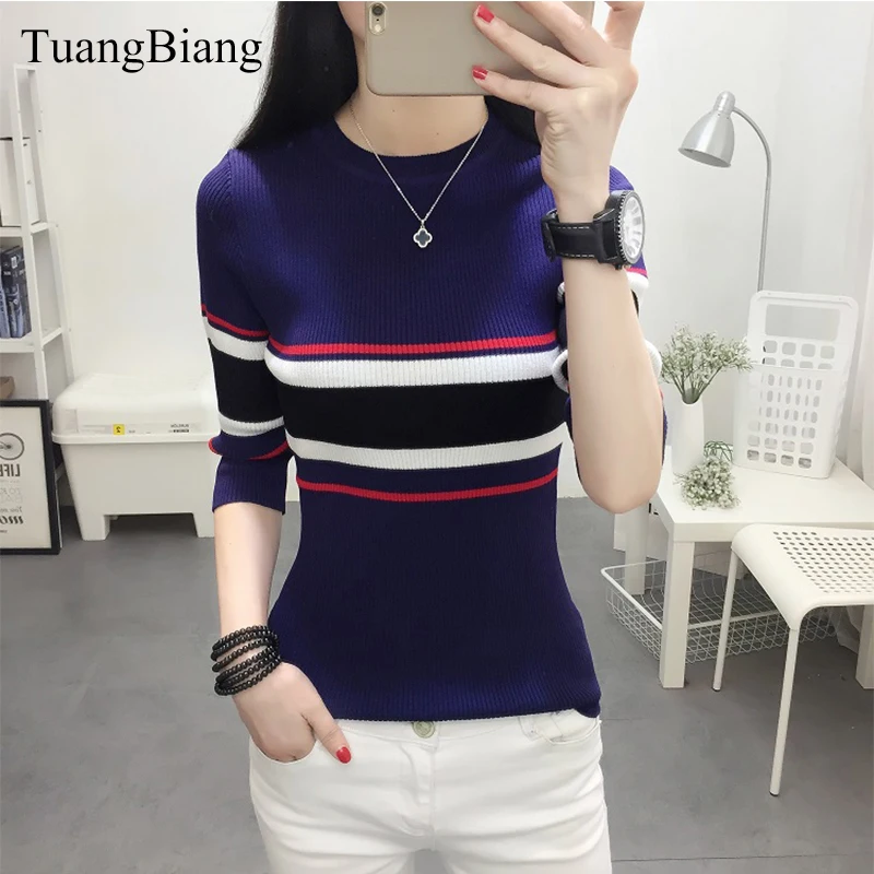 .image of 2019 Spring Women Three Quarter Sleeve Sweater Slim O-Neck Striped Pullovers Sweaters Female Autumn